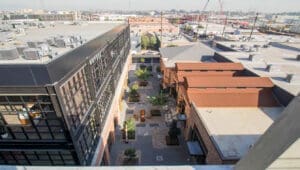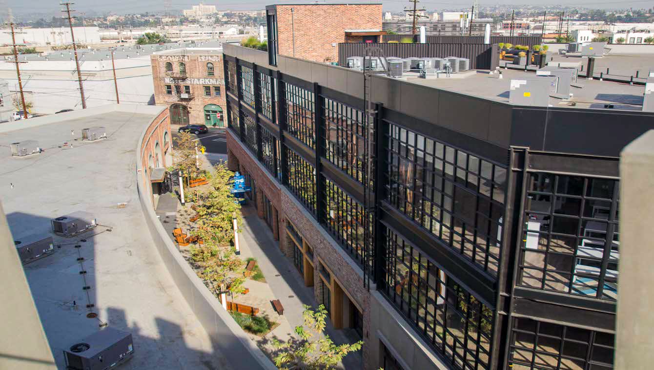 Located in the eastern section of DTLA’s revitalized Arts District, along the banks of the L.A. River and easily accessed by three major freeways, this new property infuses modern stylings with classic concrete and brick to create a compelling and unique look that is incredibly appealing. At Mateo features multiple buildings with floor-to-ceiling windows, large open spaces with 15′ exposed wood ceilings, beautiful courtyards and a rooftop lounge that features a panoramic view of the L.A. skyline. The huge rooftop deck of the 540-space parking structure, perfect for still photography, car commercials and feature films, also offers the same great view. Weekday filming is available