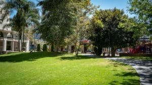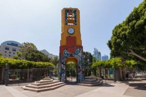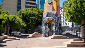 Grand Hope Park is a serene 2.5-acre urban park in the heart of DTLA. Lawrence Halprin designed the park, which is located on the Los Angeles campus of the ASU Fashion Institute of Design and Merchandising. The park combines functional art and nature in an urban setting, with decorative sidewalks, two fountains, a clock tower, pergolas, and a children’s playground. Grand Hope Park provides the perfect, tranquil contrast to the surrounding metropolitan buzz. Weekday filming is available