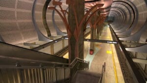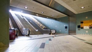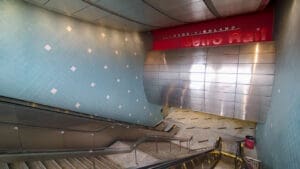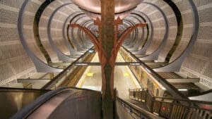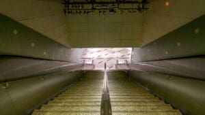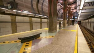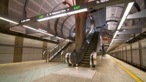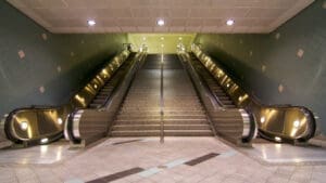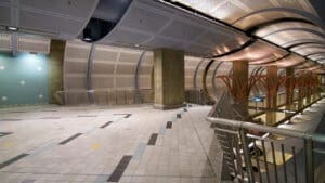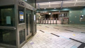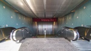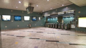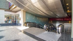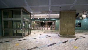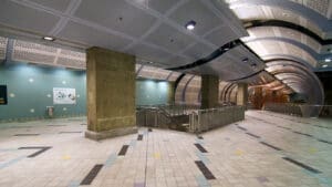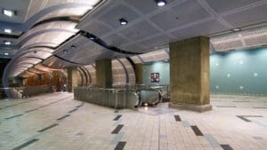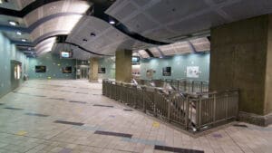 Hollywood/Highland Station is a heavy rail subway station in the Los Angeles County Metro Rail system. It is located at the intersection of Hollywood Boulevard and Highland Avenue in the Hollywood section of Los Angeles. Hollywood/Highland is a two-story station; the top level is a mezzanine with ticket machines while the bottom is the platform level. The station uses a simple island platform setup with two tracks. Architecturally, Hollywood/Highland station shares similarities with other Metro subway stations and the design of the entrance to the station may have been inspired by the entrances of New York City’s Times Square – 42nd Street / Port Authority Bus Terminal station.